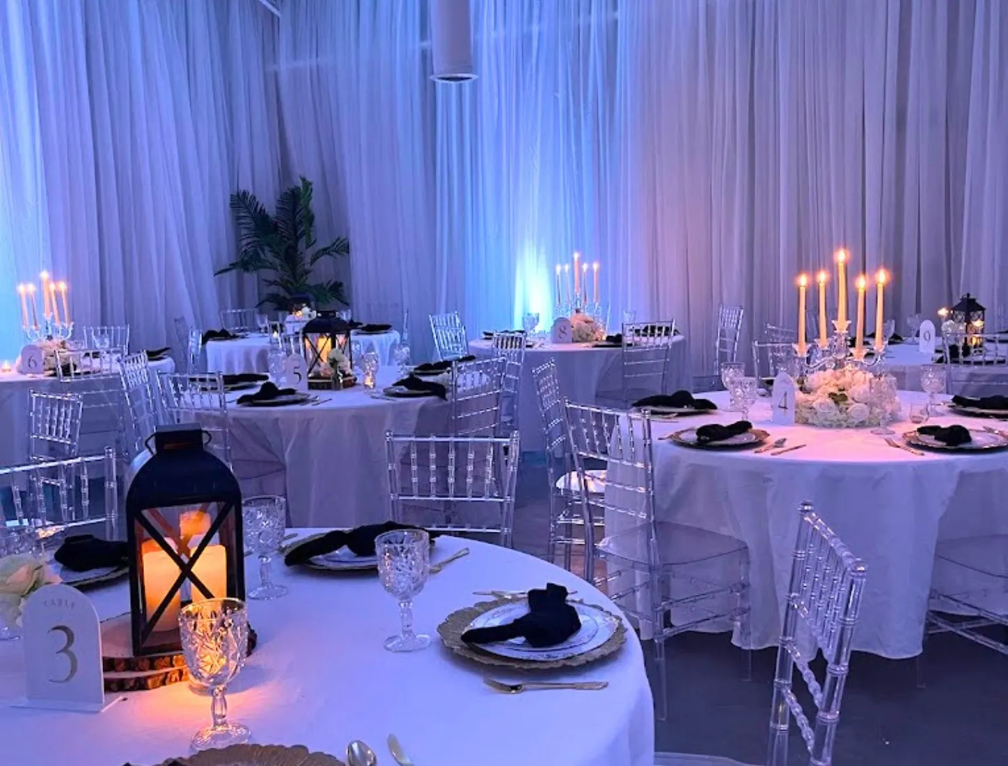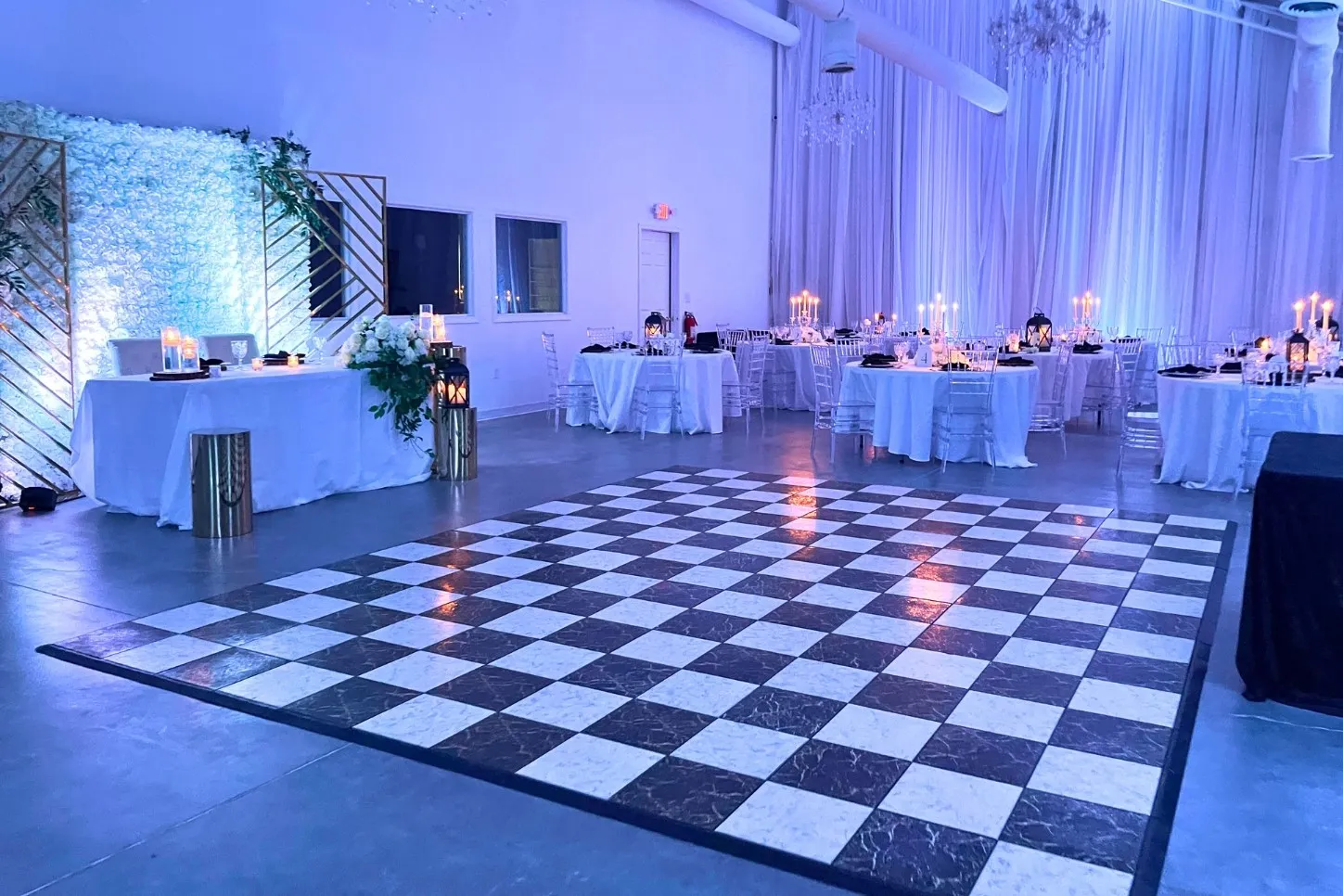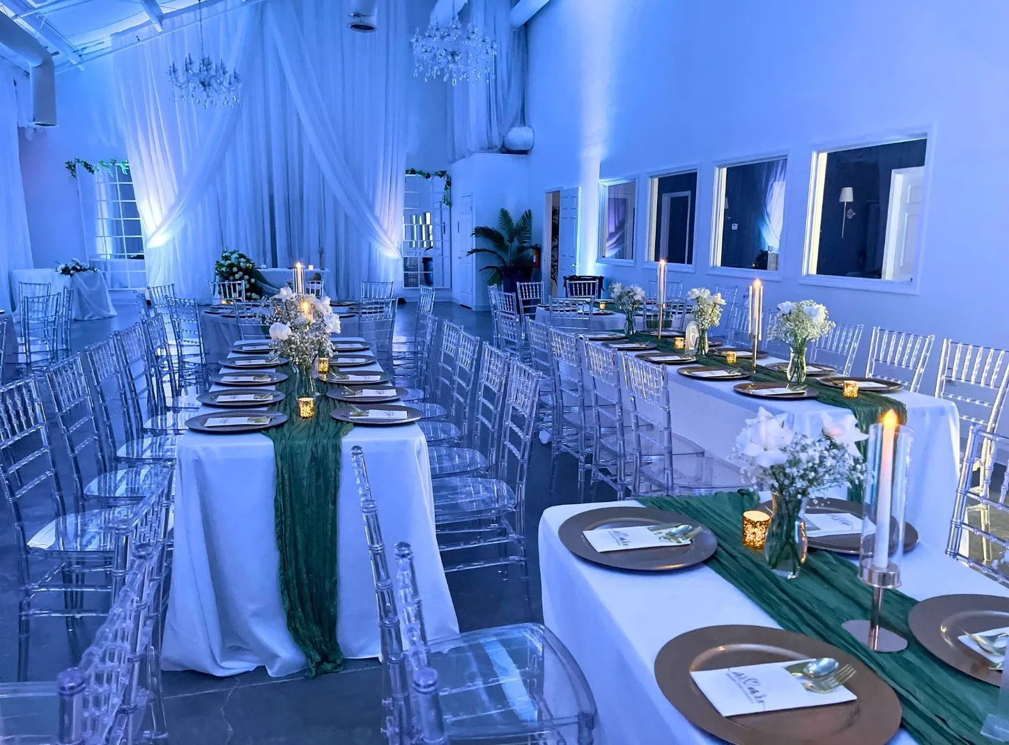 Soft, sheer white drapes line the walls, balancing the industrial design with a dreamy, romantic ambiance. With customizable up-lighting, couples can add a splash of color to reflect their wedding theme, creating a truly immersive and personalized celebration.